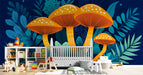The Neon Magic Mushrooms Dark Botanical Mural Wallpaper features stylized, glowing orange mushrooms rising from a bed of cool blue and teal foliage against a dark navy background. The flat vector art style and high-contrast colors create a magical, almost bioluminescent effect. This mural is perfect for a quirky powder room, a nursery, or a creative space that embraces fantasy and bold color.