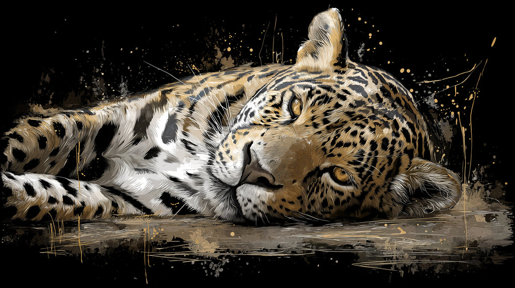 Resting Jaguar Dark Art Mural Wallpaper | Gold Splatter Accents, Intense Yellow Eyes, Luxurious Wildlife