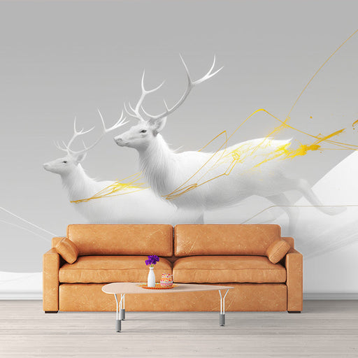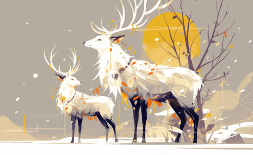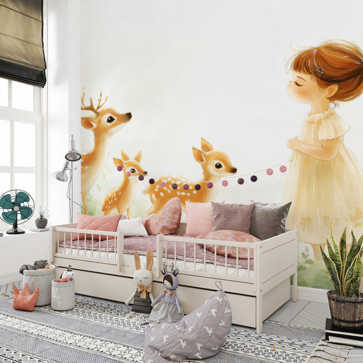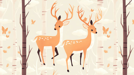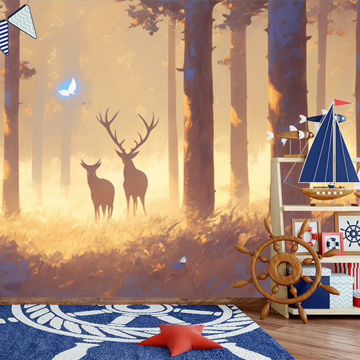This charming Rustic Deer Forest Mural Wallpaper brings a sense of modern whimsy and nature's beauty into your home. The design features a serene woodland scene with a variety of colorful trees in shades of red, orange, and blue-green, set against a textured wood-grain background. A peaceful family of deer rests in the foreground, creating a sense of calm and harmony with nature. The art style is both rustic and refined, with a focus on natural elements and a calming color palette. This wallpaper is a perfect choice for creating a cozy and serene atmosphere in a farmhouse-style bedroom, a living room, or a peaceful study.
