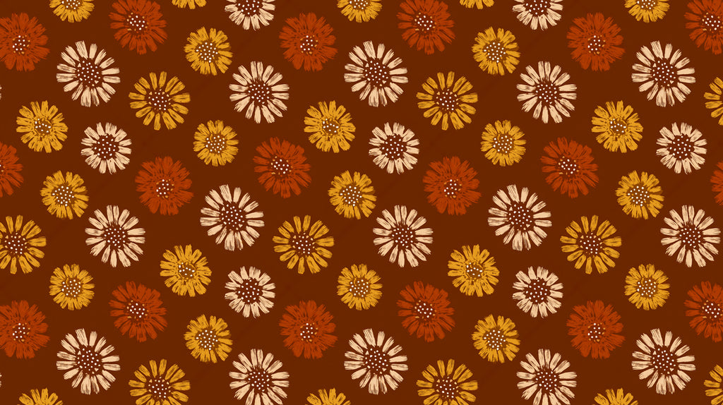The Rustic Floral Mural Wallpaper is a charming and timeless piece of art. Its design features a repeating pattern of small, stylized flowers in a warm palette of rustic orange, vibrant yellow, and soft white, all set against a rich, dark brown background. The classic design and earthy colors create a sense of cozy vintage charm and natural elegance. This mural is an ideal choice for a serene bedroom, a vintage-inspired dining room, or a charming study that seeks a touch of classic, rustic beauty.