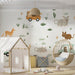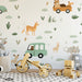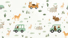 The Safari Road Trip Animal Pattern is a whimsical and sweet design. The repeating motif features cartoon animals (deer, kangaroo-like figures, rodents) interspersed with mint green vintage jeeps carrying friendly bears. The simple green and brown foliage on a clean white background adds an organic, playful feel. This mural is ideal for a gender-neutral nursery or a child's playroom with a soft, adventurous theme.