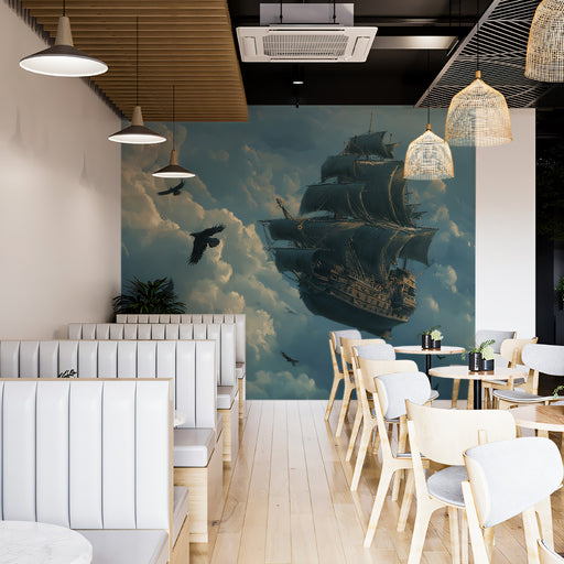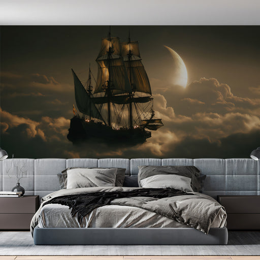 Sailing Ship in Sky Mural Wallpaper | Surreal Fantasy, Fluffy Clouds, Celestial Ocean View