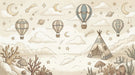 Spark a sense of adventure with this vintage-style sketch mural. Rendered in monochromatic sepia tones, it features a playful landscape of patterned hot air balloons, planets, moons, and a cute teepee tent among mushrooms and coral-like plants. The hand-drawn line art style is gentle on the eyes and stimulates imagination without overstimulating the senses, perfect for a calm and creative nursery.