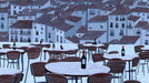 The Snowy Rooftops Bar Scene Mural Wallpaper presents a stark, graphic vision of a European hilltop town covered in snow or heavy mist. The repetitive white buildings with dark red-brown roofs create a striking, patterned backdrop. In the foreground, an array of minimalist outdoor bar tables and slatted chairs, also coated in white frost or snow, emphasizes the cool, blue-toned atmosphere. The composition uses clean lines and strong repetition to convey a sense of vast, quiet order. This mural is ideal for a modern living room, a minimalist dining area, or a contemporary office that appreciates clean, strong architectural graphics.