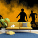 The Soccer Silhouette Smoke Mural Wallpaper is a powerful and stark graphic artwork. It features three black player silhouettes in dynamic running and kicking poses, set against a massive, vibrant cloud of electric yellow/orange smoke or dust. The deep black background enhances the extreme contrast, focusing all attention on the players' motion and the aggressive color burst. This mural is ideal for a modern entryway, a dedicated sports den, or a contemporary space that requires a bold, energetic, and minimalist statement.