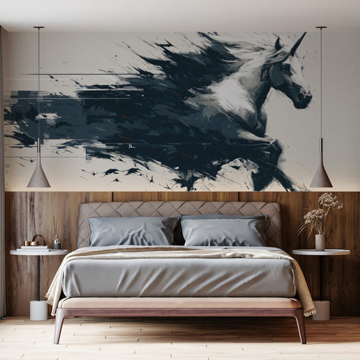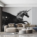 Winged Unicorn Dissolving into Bats Black White Ink Wash Mural Wallpaper | Dynamic Fantasy Transformation