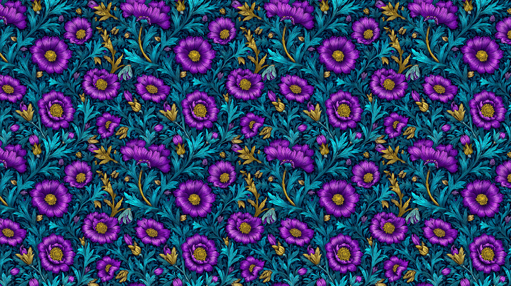 Aggiungi un margine di sicurezza di 6-10 cm. L'area totale è calcolata in metri quadrati e arrotondata al numero intero più vicino.Carta da parati murale floreale vivace | Viola e turchese moderni