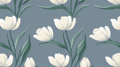 VIVAWALLSIl wallpaper "White Tulip" presenta eleganti tulipani avorio che si stagliano con grazia su uno sfondo blu ardesia. Le fine pennellate in stile mat...