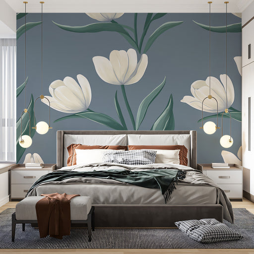 Fiori di Tulipano Bianco Sfondo | Murales Botanico Minimalista su Sfondo Blu Ardesia