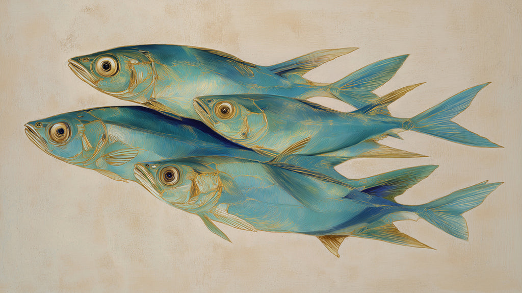 Lasciati trasportare in un mondo di serena bellezza con questa affascinante carta da parati, che presenta una splendida pittura di un banco di pesci che nuotano con grazia in acque azzurre-verdastre. I pesci, in tonalità di blu e delicato oro, sono rappresentati con forme eleganti e movimenti fluidi, creando un senso di armonia, tranquillità e della profonda bellezza della vita acquatica. Lo stile pittorico discreto e lo sfondo chiaro e arioso evocano una sensazione di pace e calma. Questa illustrazione è perfetta per creare un'atmosfera calma, invitante e pacifica in studi, soggiorni o qualsiasi spazio che apprezzi l'arte raffinata e le scene naturali serene.