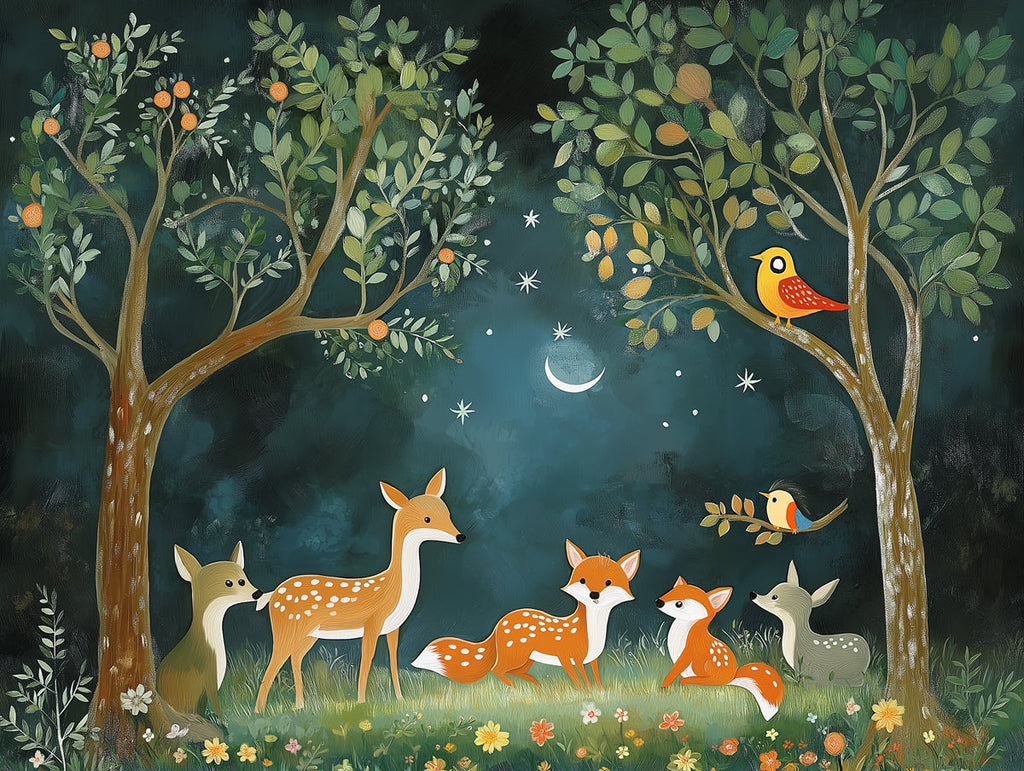 Lo stile è carino e ispirato alla natura, con un focus su una scena notturna nella foresta con animali. Questo sfondo sarebbe ideale per una nursery con una decorazione contemporanea, rustica o a tema natura. Potrebbe anche funzionare bene in una camera da letto per bambini o in una sala giochi per aumentare l'atmosfera giocosa e naturale.