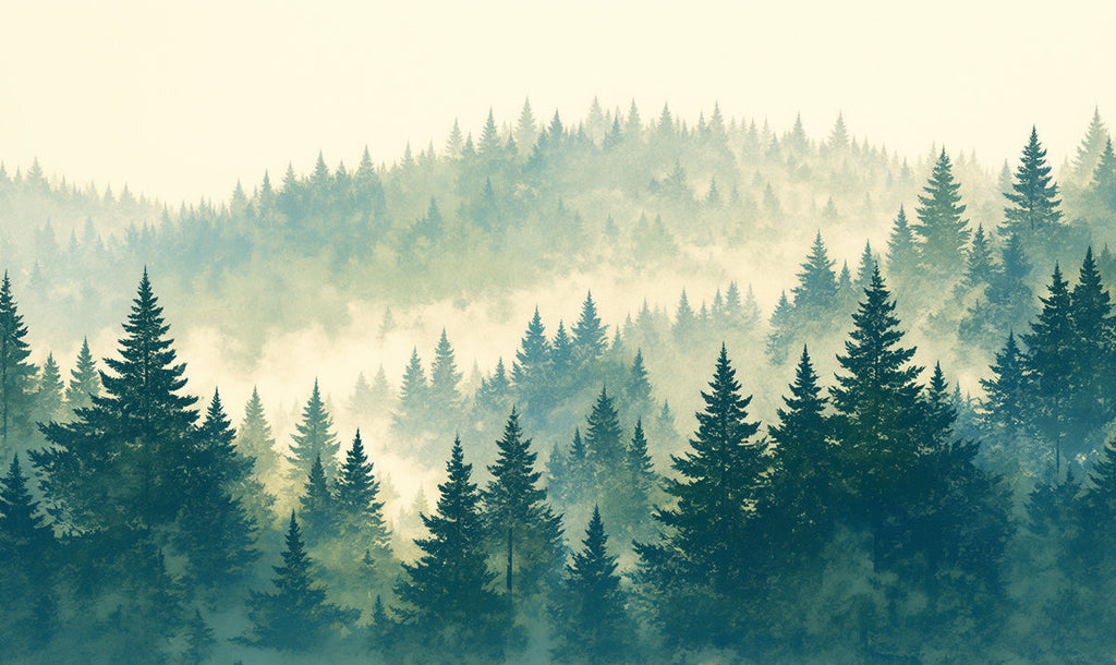 Aggiungi un margine di sicurezza di 6-10 cm. L'area totale è calcolata in metri quadrati e arrotondata al numero intero più vicino.Carta da parati murale della foresta nebbiosa | Verde blu e beige foresta