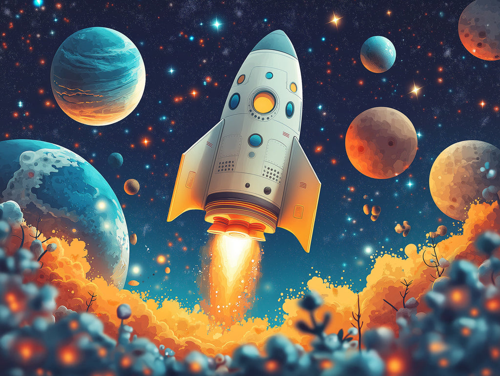 I colori in questo sfondo sono armoniosi e creano un aspetto visivamente attraente e coeso. Il blu profondo dello spazio contrasta con il rosso brillante e l'arancione delle fiamme della navicella, mentre i vari colori dei pianeti aggiungono profondità e interesse. La combinazione di questi colori funziona bene per rendere la scena vivida.
