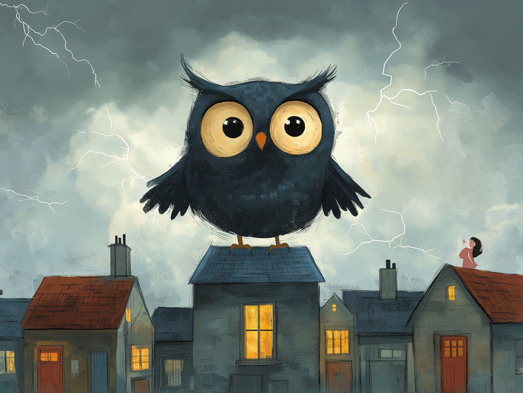 Questo sfondo mostra un grande gufo in stile cartoon in piedi su un tetto con un cielo tempestoso sullo sfondo. Il design è carino e capriccioso, rendendolo perfetto per una nursery. Può creare un ambiente divertente e immaginativo per un bambino.
