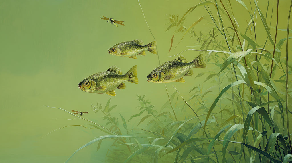 Immergiti nella serena bellezza di un mondo acquatico con questa affascinante carta da parati, che presenta una collezione di carpe dorate stilizzate nuotare elegantemente in mezzo a una rigogliosa varietà di canne alte e delicate piante acquatiche. Le tonalità fresche di verde chiaro e blu dell'acqua, realizzate in stile pittorico, evocano un senso di calma, tranquillità e della profonda bellezza di uno stagno nascosto. Delicate libellule fluttuano giocose sopra la superficie dell'acqua, aggiungendo un tocco di movimento fantastico. Questa illustrazione è perfetta per creare un'atmosfera calma, invitante e pacifica in salotti, bagni o qualsiasi spazio che apprezza la bellezza naturale e scene serene.