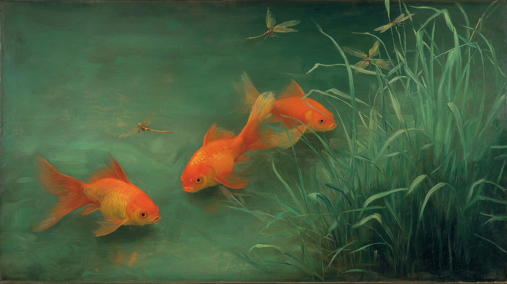 Lasciati trasportare in un mondo di serena bellezza con questa affascinante carta da parati, che presenta un classico dipinto ad olio di pesci rossi e libellule in uno stagno tranquillo. I pesci rossi, vibranti di arancione e bianco, nuotano con grazia tra verdi canne rigogliose, mentre delicate libellule volteggiano sopra. Lo stile pittorico, con pennellate visibili e colori ricchi e profondi, evoca un senso di calma, tranquillità e della profonda bellezza della natura. Questa illustrazione è perfetta per creare un'atmosfera calma, invitante e pacifica in camere da letto, salotti o qualsiasi spazio che apprezzi l'arte classica e le serene scene naturali.