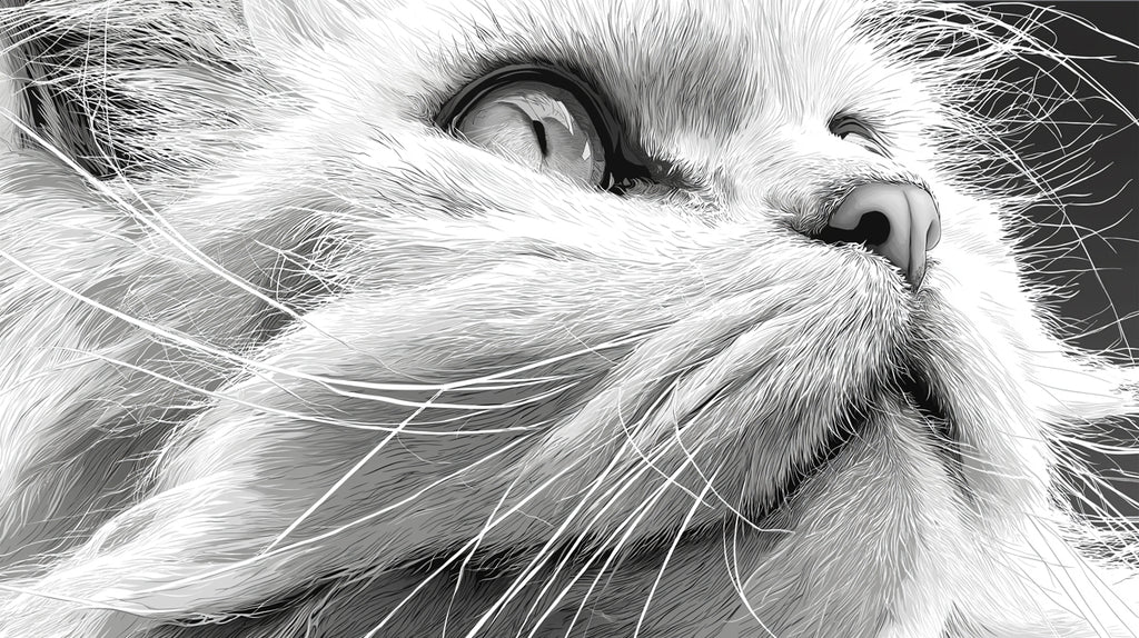 Aggiungi un margine di sicurezza di 6-10 cm. L'area totale è calcolata in metri quadrati e arrotondata al numero intero più vicino.Carta da parati con ritratto di gatto maestoso inciso | Arte felina monocromatica espressiva