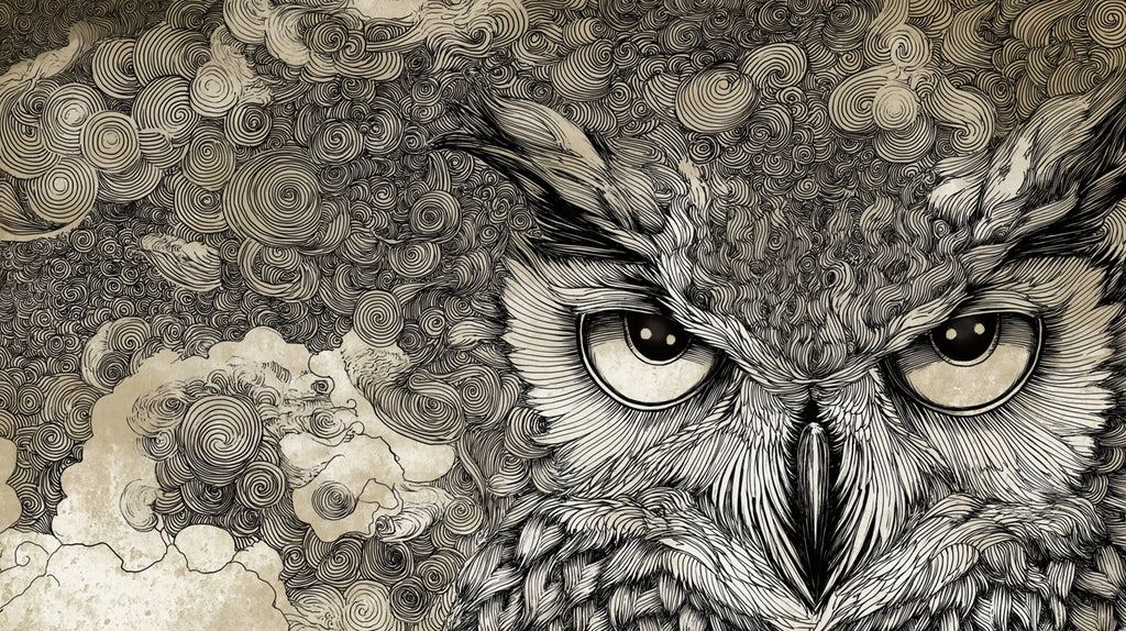 Aggiungi un margine di sicurezza di 6-10 cm. L'area totale è calcolata in metri quadrati e arrotondata al numero intero più vicino.Murale di carta da parati con disegno a linee dell'Gufo Malinconico | Dettagliato schizzo notturno con motivi vorticosi