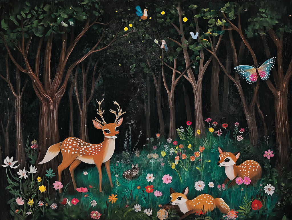 I colori in questo sfondo sono armoniosi e creano una scena visivamente attraente e bilanciata. I verdi e blu scuri della foresta offrono un ottimo sfondo per gli animali e i fiori colorati, mentre le luci e le ombre aggiungono profondità.