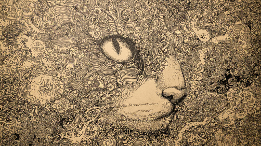 Aggiungi un margine di sicurezza di 6-10 cm. L'area totale è calcolata in metri quadrati e arrotondata al numero intero più vicino.Murale con carta da parati a linee artistiche di gatto misterioso | Dettagliato schizzo felino con motivi vorticosi