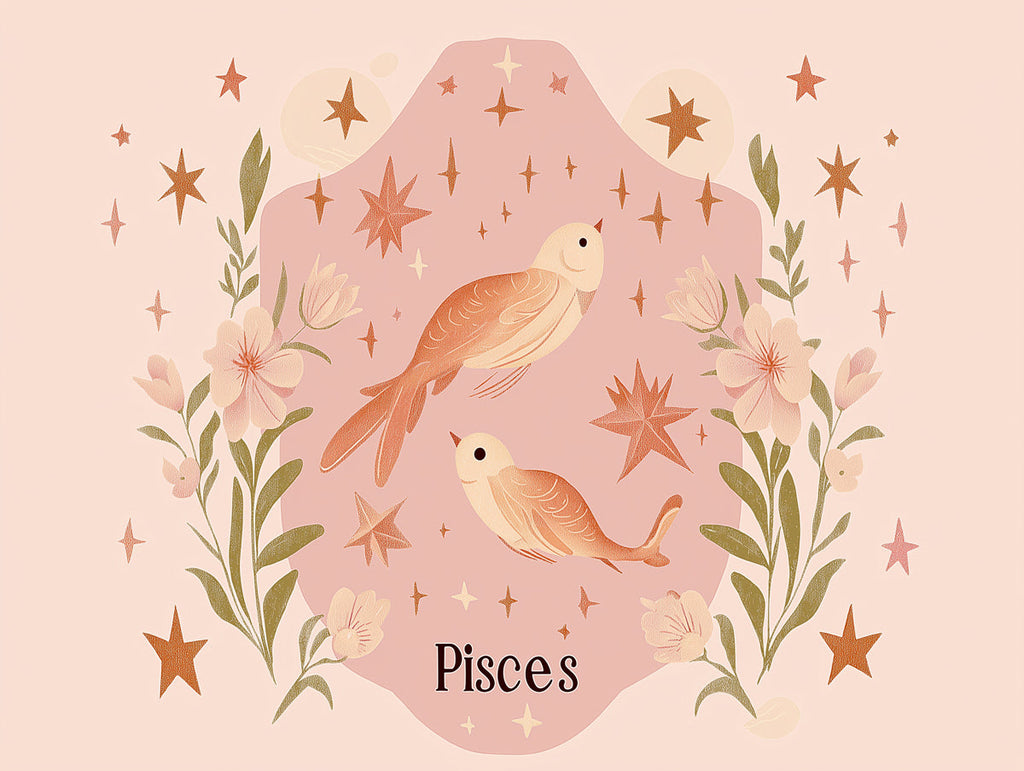 La tavolozza di colori pastello di blu, rosa e gialli morbidi nel pesce e sullo sfondo crea un aspetto delicato e armonioso. Gli elementi floreali aggiungono un tocco di variazione naturale dei colori, mentre le stelle forniscono un contrasto sottile in bianco. I colori si fondono insieme in modo impeccabile, evocando una sensazione di calma e una connessione con l'elemento acqua associato ai Pesci. Lo schema cromatico complessivo è rilassante e visualmente attraente, perfetto per creare un'atmosfera rilassante.