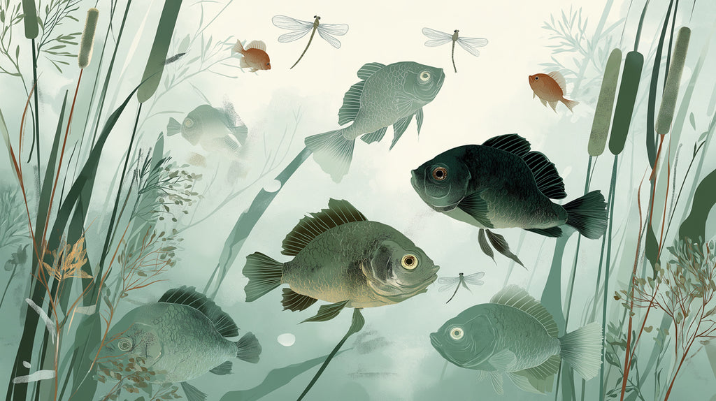 Immergiti nella serena bellezza di un mondo acquatico con questa affascinante carta da parati, che presenta una collezione di pesci stilizzati che nuotano aggraziati tra alte canne e delicati muschi d'acqua. I pesci, in morbide tonalità di grigio, blu e marrone, sono accompagnati da c capricciosi che fluttuano sopra la superficie. Le fresche tonalità di verde chiaro e blu dell'acqua, realizzate in uno stile pittorico, evocano una sensazione di calma, tranquillità e della profonda bellezza di uno stagno nascosto. Questa illustrazione è perfetta per creare un'atmosfera calma, invitante e pacifica in camere da letto, studi o qualsiasi spazio che apprezzi la bellezza naturale e scene serene.