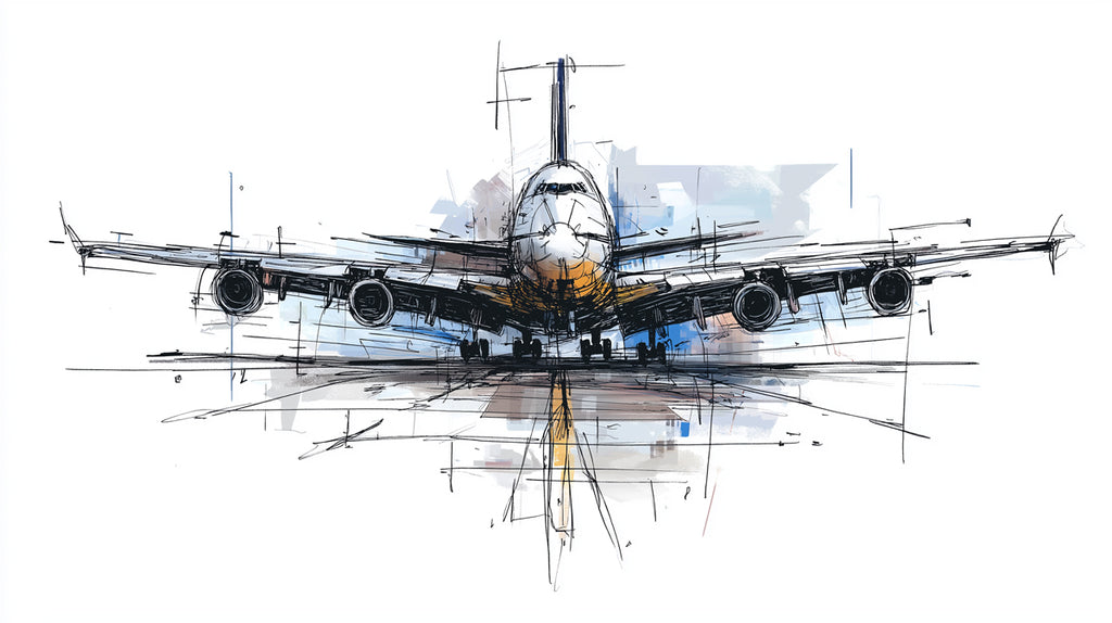 La Bozza di Murale a Forma di Aereo su Carta da Parati presenta un design accattivante e dinamico di un grande aereo realizzato in uno stile schizzo grezzo ed espressivo. Le linee sottili ed energetiche e gli accenti simili all'acquarello nei toni del blu e dell'oro caldo creano un senso di movimento e arte moderna, evocando il potere e l'eccitazione del viaggio.