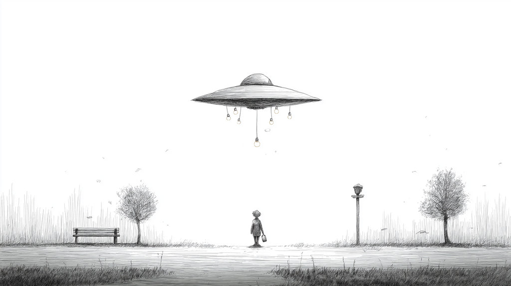 Entra in un mondo di tranquillo stupore con questo minimalista sfondo, che presenta un affascinante illustrazione a mano di un bambino in piedi in un parco, intento a guardare in alto verso un misterioso UFO sospeso sopra di lui. L'UFO, dalla classica forma a disco volante, emette una luce soffusa da lampadine pendenti, creando una scena stravagante e leggermente surreale. Lo stile semplice del disegno a schizzo con texture sottili per l'erba, gli alberi e una panchina distante evoca un senso di innocenza, curiosità e meraviglia infantile. Questa illustrazione è perfetta per creare un’atmosfera calma, immaginativa e accogliente in camere dei bambini, nursery, o in qualsiasi spazio che apprezzi la fantasia discreta e un tocco di straordinarietà in ambienti naturali.