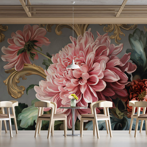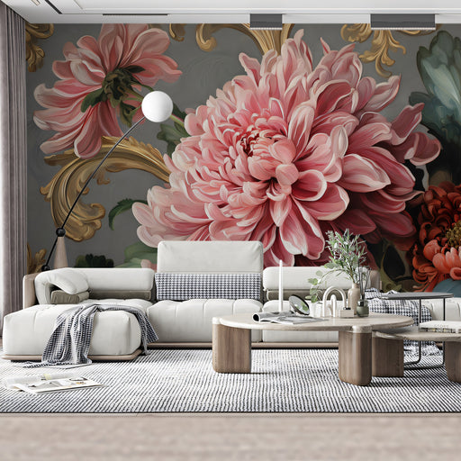 Carta da parati murale con fiori rococò crisantemo | Arte classica con volute dorate