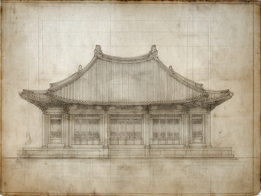Vivawalls StoreThis illustration is a detailed architectural elevation drawing of a traditional Chinese hall or temple structure. Rendered in sepia tones on an ag...