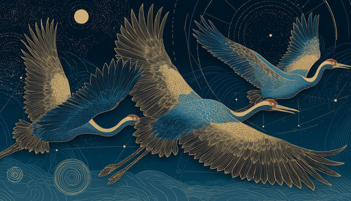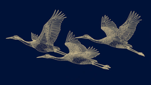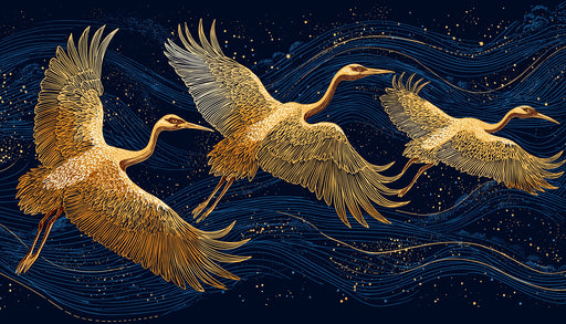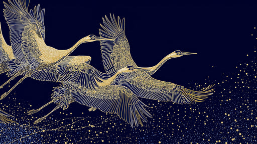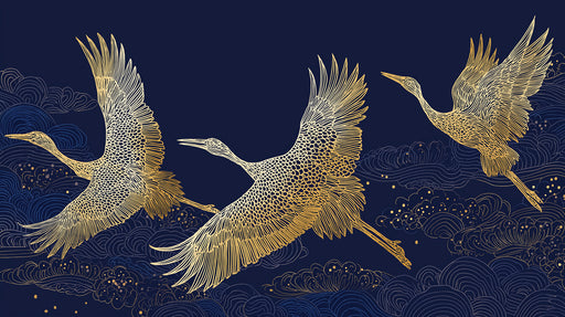 VIVAWALLSIl Murale con Gru Dorate e Nuvole presenta un design lussuoso e sereno con tre eleganti gru profilate in oro su uno sfondo blu navy profondo, circo...