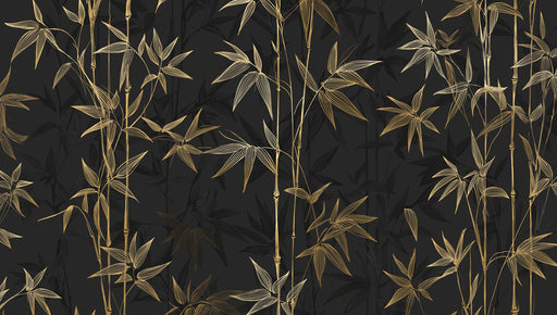 VIVAWALLSIl Murale Tappezzeria di Bambù Dorato Fluente su Sfondo Grigio Scuro presenta un design elegante e raffinato di steli e foglie di bambù dorati stil...