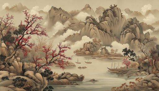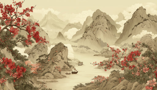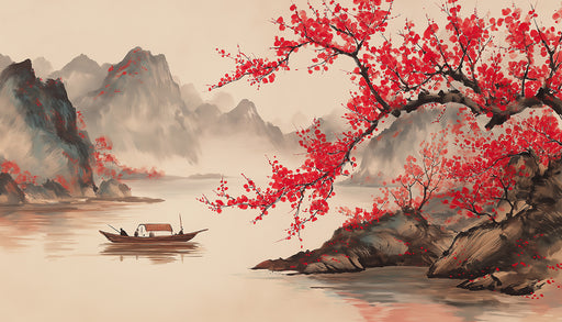 Visualizza tutti i dettagliMurale fiori di pruno rosso | Paesaggio cinese tradizionale con barca