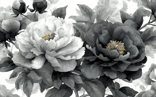 Visualizza tutti i dettagliMurale Floreale di Peonie in Bianco e Nero | Elegante Nero e Bianco con Oro