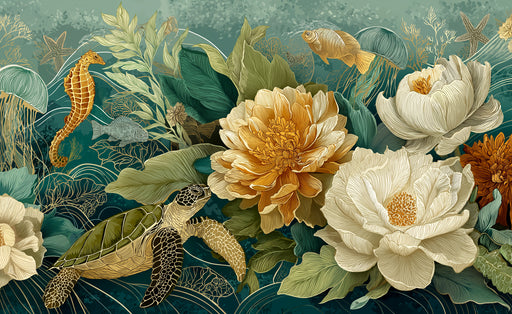 Visualizza tutti i dettagliAffresco Murale Subacqueo Opulento | Peonie Dorate e Creature Marine