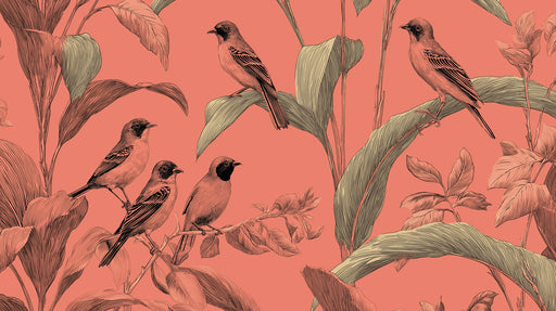 Carta da parati murale con uccelli tropicali classici | Stampa calda corallo e verde