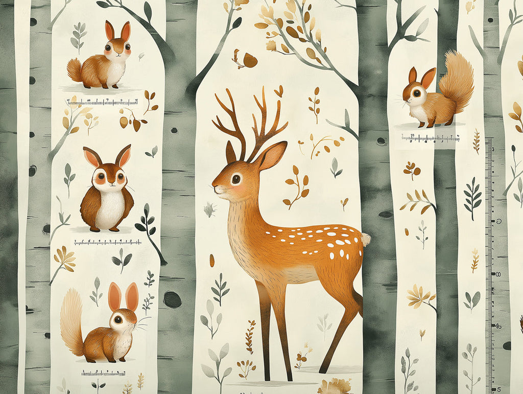Questo sfondo mostra una foresta vivace con una varietà di animali impegnati in diverse attività. I cervi stanno saltando giocosamente, i conigli stanno saltellando intorno e l'allocco li sorveglia. Ci sono anche ricci che rotolano sul terreno e farfalle che svolazzano ovunque. Gli alberi sono alti e pieni di foglie, e ci sono funghi e fiori selvatici alla base. In una cameretta per bambini, crea un'atmosfera avventurosa e vivace. I bambini possono immaginare di intraprendere avventure nella foresta con questi animali amichevoli, favorendo la creatività e l'amore per la natura.