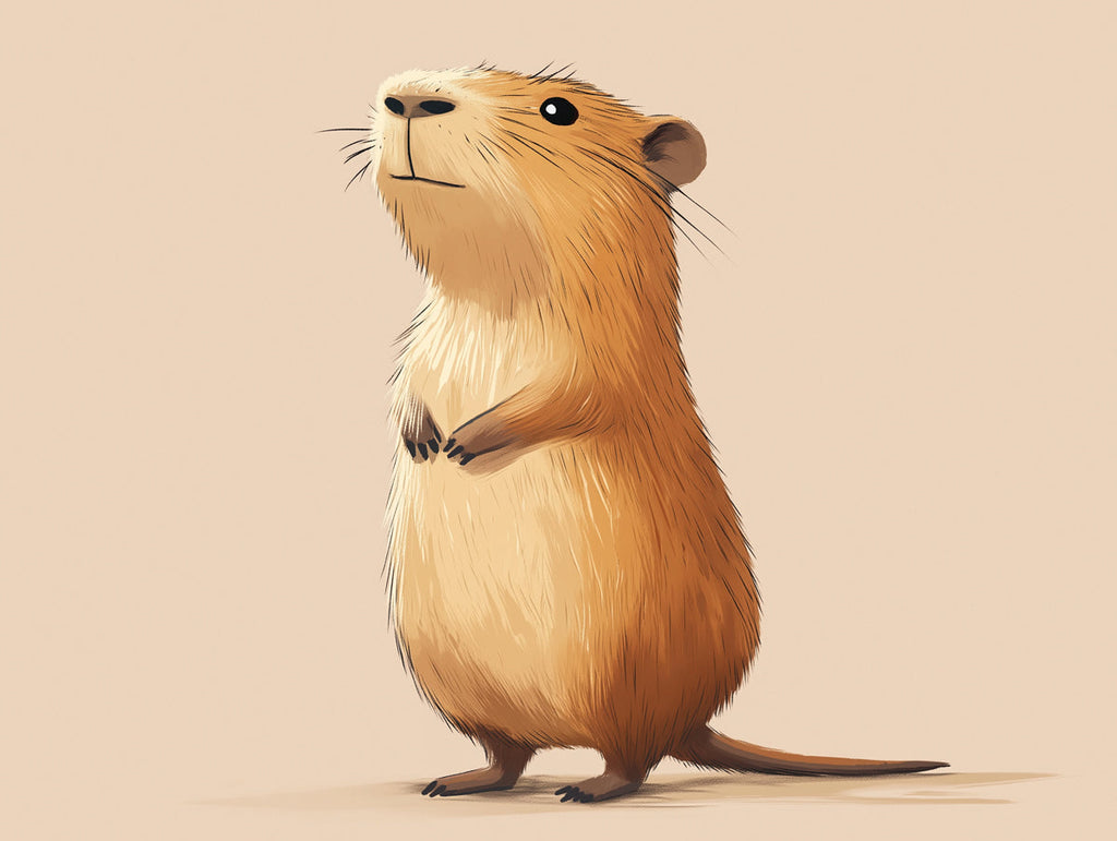 Questo sfondo mostra una grande e carina capibara in piedi eretta su uno sfondo color crema. Il pelo della capibara è rappresentato in vari toni di marrone, con texture dettagliate per mostrare la sua morbidezza. In una camera da letto o in una sala giochi per bambini, crea un'atmosfera amichevole e accogliente. La capibara, nota per la sua natura gentile e affettuosa, può portare un senso di calore e giocosità nello spazio, attirando i bambini che amano gli animali.