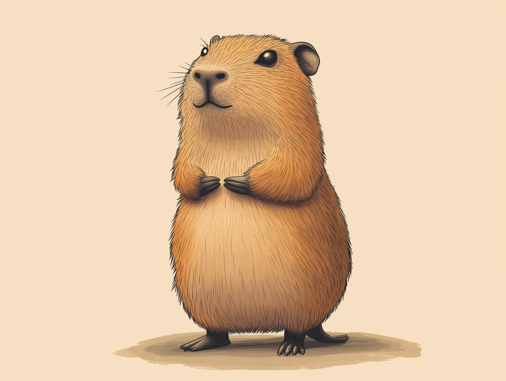 Questo sfondo mostra una grande e carina capibara in piedi eretta su uno sfondo color crema. Il pelo della capibara è rappresentato in vari toni di marrone, con texture dettagliate per mostrare la sua morbidezza. In una camera da letto o in una sala giochi per bambini, crea un'atmosfera amichevole e accogliente. La capibara, nota per la sua natura gentile e affettuosa, può portare un senso di calore e giocosità nello spazio, attirando i bambini che amano gli animali.