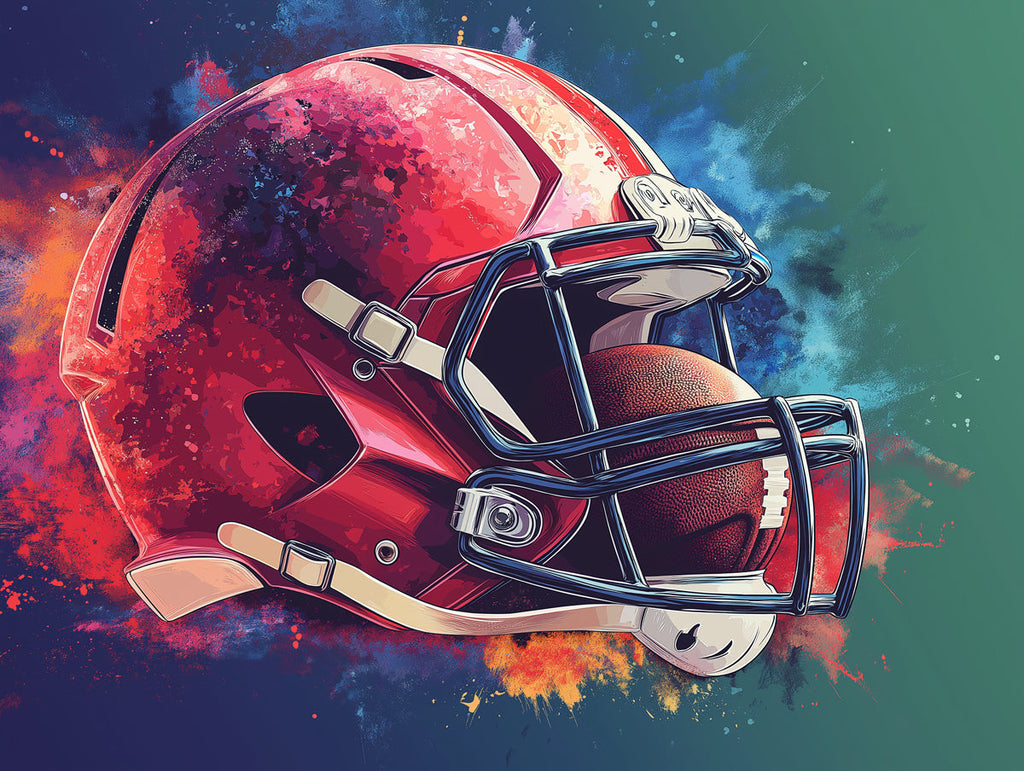 Questo sfondo mostra una rappresentazione astratta e colorata di un casco da rugby con un rugby all'interno, su uno sfondo vibrante e artistico. Il design è audace e moderno, rendendolo una scelta eccellente per una camera da letto per aggiungere un tocco di creatività e un'atmosfera sportiva. Il grande casco crea un punto focale nella stanza.