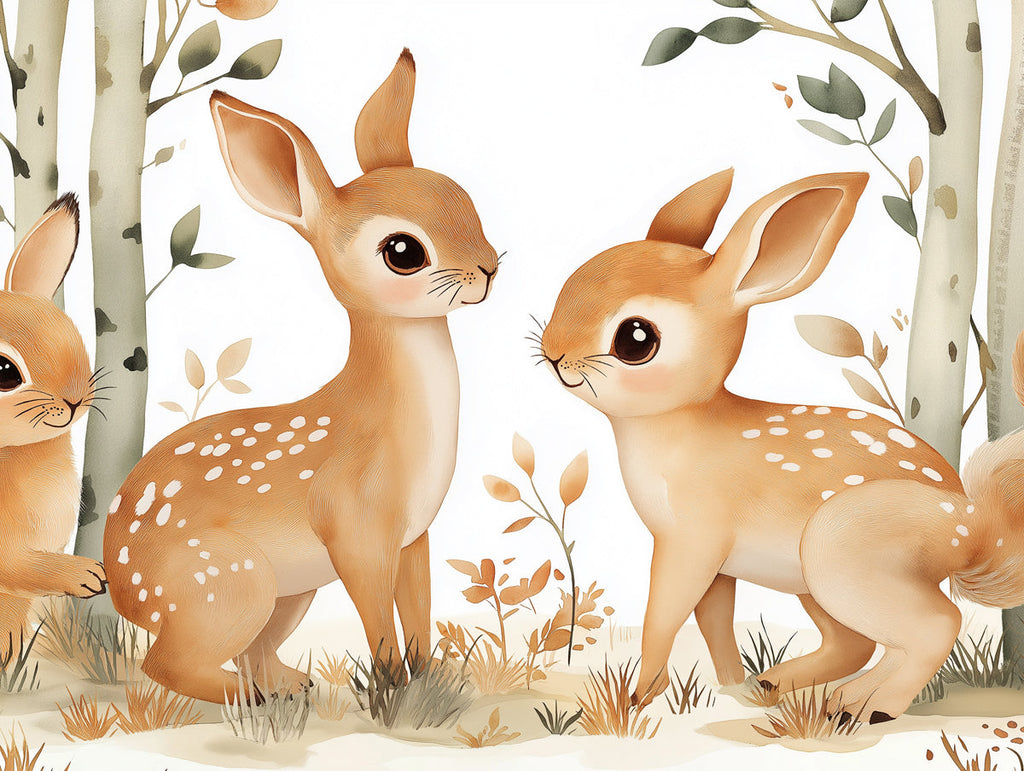 Il wallpaper raffigura una foresta magica dove gli animali sembrano far parte di una storia. I cervi sono circondati da un morbido bagliore dorato, e i conigli sembrano tenere minuscole lanterne. L'allocco sta ululando, e ci sono fate con ali luminose che svolazzano tra gli alberi. Lo sfondo ha un cielo onirico e color pastello, che aggiunge un tocco incantato. In una nursery, crea un'atmosfera serena e magica, ispirando storie per la buonanotte e dolci sogni. La combinazione degli animali carini e degli elementi magici può calmare e stimolare l'immaginazione di un bambino.