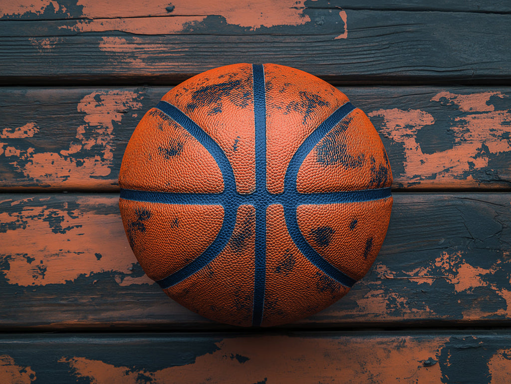 I colori di questo sfondo sono armoniosi e creano un'atmosfera calda e accogliente. L'arancione e il blu del pallacanestro completano i toni marroni dello sfondo in legno, creando un design equilibrato e coeso.