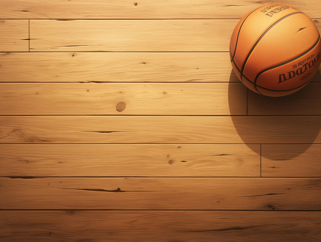 I colori di questo sfondo sono armoniosi e creano un'atmosfera calda e accogliente. L'arancione e il blu del pallacanestro completano i toni marroni dello sfondo in legno, creando un design equilibrato e coeso.
