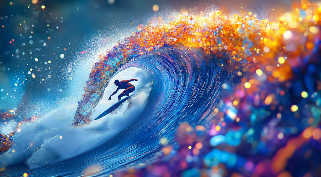 Il wallpaper raffigura un surfista che cavalca un'onda con uno sfondo cosmico di particelle e luci colorate. In una camera da letto, crea un'atmosfera onirica e vivace, mescolando l'eccitazione del surf con la magia dell'universo.