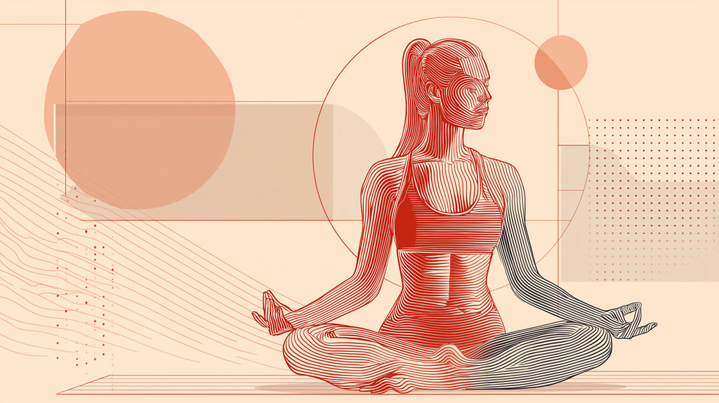 Trova il tuo centro con questo sfondo sereno e affascinante, che presenta una posa yoga meditativa realizzata in uno stile lineare elegante con contrasti di colore sorprendenti. Una figura femminile nella posizione del loto è rappresentata con linee fluide e dettagli anatomici sottili, messi in risalto da tonalità vibranti di rosso e blu freddo. Forme geometriche astratte e linee tenui creano un senso di equilibrio, tranquillità e moderna serenità sullo sfondo. Questa illustrazione è perfetta per creare un'atmosfera calma, contemplativa e artistica in studi di yoga, spazi per la meditazione, camere da letto, o qualsiasi ambiente che apprezzi il benessere e l'arte contemporanea.