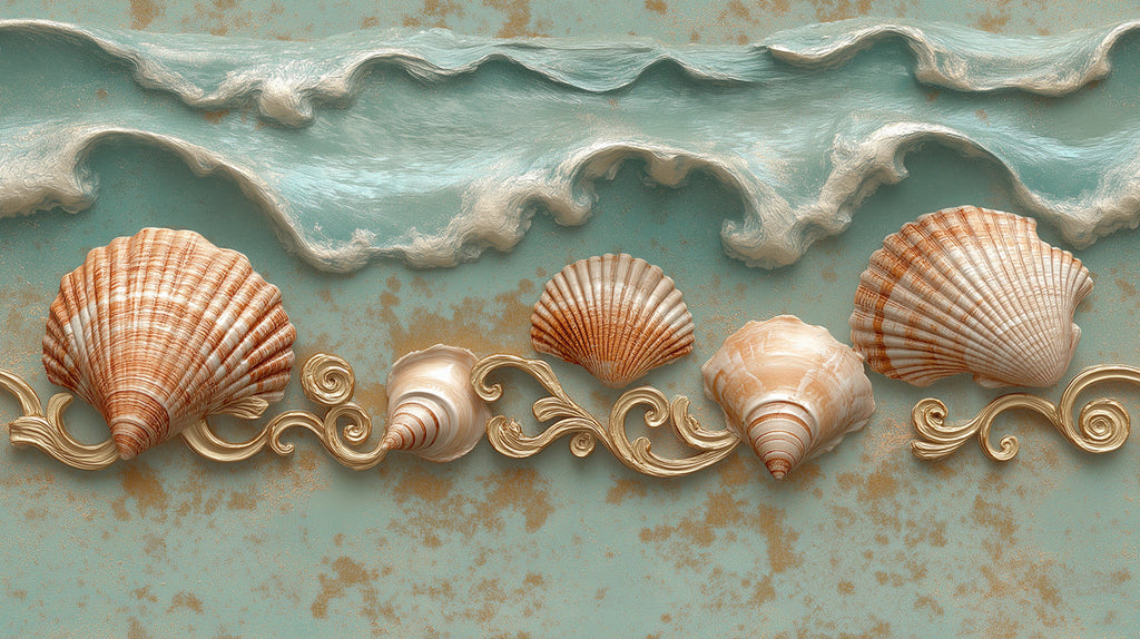 Questo sfondo mostra grandi conchiglie dettagliate su uno sfondo di onde dolcemente ondulate. Le conchiglie sono il punto focale, con i loro motivi naturali e i caldi colori terrosi. Le onde sono rappresentate in morbidi blu e verdi, aggiungendo un senso di calma e movimento. L'intera scena è serena e richiama un tranquillo giorno in spiaggia. In una camera da letto, crea un'atmosfera accogliente e rilassante. Le conchiglie e le onde possono evocare una sensazione di mare, facendo sentire lo spazio come un rifugio costiero, ideale per rilassarsi.