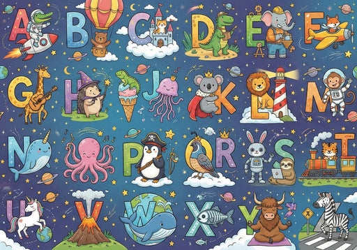 Vivawalls StoreThe Playful Space and Magic Animal Alphabet Wall Mural features a delightfully detailed A-to-Z alphabet set against a vibrant, starry night sky, wh...