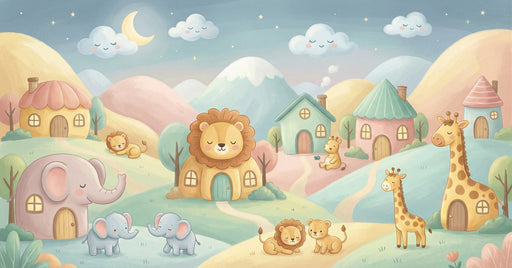 Vivawalls StoreThe Pastel Safari Animal Village Landscape Wall Mural features a sweet, dreamy illustration of cute safari animals like elephants, lions, and giraf...