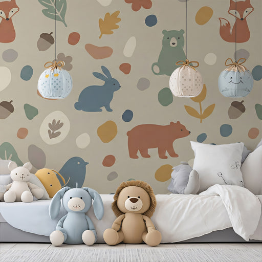 Vivawalls StoreThe Cute Woodland Creatures and Pebbles Wall Mural features an adorable, seamless pattern of friendly woodland animals including raccoons, squirrel...