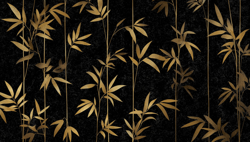 Aggiungi un margine di sicurezza di 6-10 cm. L'area totale è calcolata in metri quadrati e arrotondata al numero intero più vicino.Carta da parati murale con bambù dorato fluente su sfondo nero | Arte botanica serena